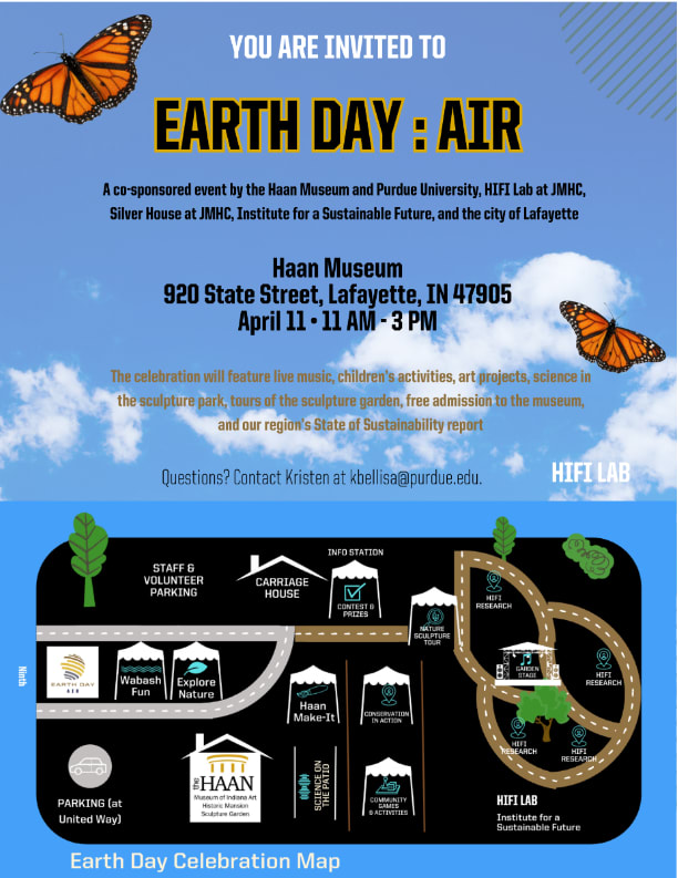 Please join us in celebrating eARTh Day: AIR! This community Earth Day event explores the importance of air through science, art, music, and environmental discovery. The event will take place Saturday, April 11, from 11AM to 3PM at the Haan Museum of Indiana Art (920 State Street, Lafayette, IN) and is free and open to the public. The museum will be open for free tours from 11AM to 4PM, an hour after all other activities have ended so you don't have to miss a thing! This year’s theme, Air, highlights the invisible forces that shape life on Earth—from atmosphere and climate to breath, sound, and the movement of wildlife across landscapes. The celebration is co-sponsored by the Haan Museum of Indiana Art, Purdue University’s HIFI Lab at the John Martinson Honors College, Silver House at JMHC, the Purdue Institute for a Sustainable Future, and the City of Lafayette. Visitors will experience a lively afternoon of activities across the museum grounds and sculpture garden, including: Live music on the garden stage Hands-on science and art activities for children Interactive exhibits and research demonstrations Nature and sculpture garden tours Community games and sustainability displays A presentation of the region’s State of Sustainability report Researchers from Purdue’s HIFI Lab will also share how scientists study the environment by observing patterns in the atmosphere, soundscapes, and biodiversity, helping communities better understand and protect natural systems. Set within the museum’s historic mansion and outdoor sculpture garden, eARTh Day: AIR invites families, students, and community members to celebrate Earth Day through curiosity, creativity, and shared discovery. For questions about the event, contact Kristen Bellisario at kbellisa@purdue.edu or Kelly Rosales at admin@haanmuseum.org.