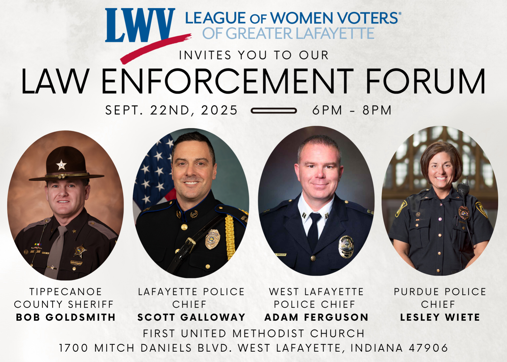 This event will bring together local law enforcement leaders to discuss current challenges facing their departments and the communities they serve. Confirmed participants include Sheriff Goldsmith, Lafayette Police Chief Scott Galloway, West Lafayette Police Chief Adam Feruson, and Purdue Police Chief Leslie Weite.